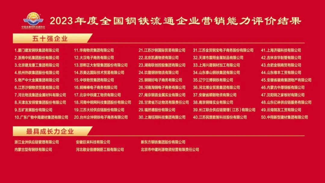 大會同期舉行的“2023年度全國鋼鐵流通企業(yè)營銷能力評價結果(五十強企業(yè))發(fā)布與頒獎儀式”,廈門建發(fā)鋼鐵集團有限公司等五十家會員單位獲得了“五十強企業(yè)”的殊榮。